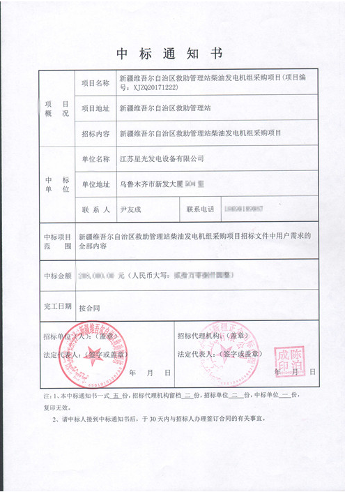 新疆維吾爾自治區救助管理站柴油發電機組采購項目(項目編號:XJZQ20171222)我公司中標,采購人:新疆維吾爾自治區救助管理站。本項目招標的柴油發電機組型號為XG-500GF;柴油機型號為玉柴YC6T700L-D20;發電機型號為星光TFW2-500-4。 ..