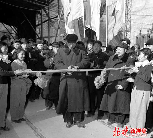 1955年12月27日,中國第一座自行設計、施工、建造的自動化水電站——官廳水電站第一臺水力發電機開始發電。這座水力發電站裝備著中國自制的第一批大型水輪發電機,于1956年4月全部建成發電。這是時任北京市市長彭真在剪彩。圖:新華 來源:北..